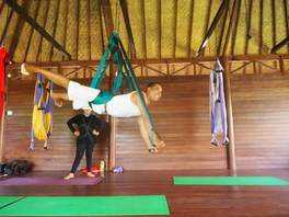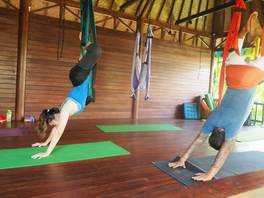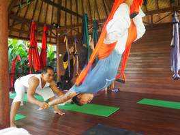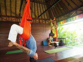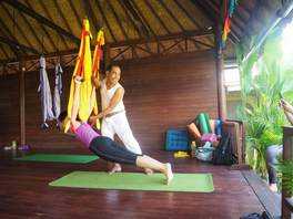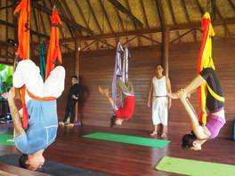 Anti Gravity yoga is the most popular aerial yoga. It involves performing a series exercises inspired by yoga asana, Pilates, calisthenics and aerial acrobatics in a hammock, in order to achieve a total body workout.