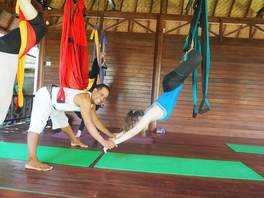A special kind of hammock which can support up to 300 kilos of weight. The rig consist of support chain, a webbing strap, a parachute hammock and carabineers. The hammock acts like a swing, supporting the hips for forward bends and back bends. Yoga postures which beginners find difficult to do on the ground, such as inversion poses, may be easier in mid-air using the hammock.
